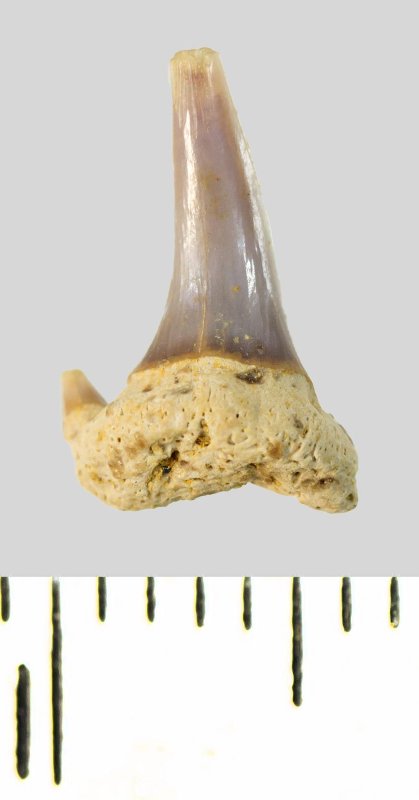 Зуб. Акула. Eostriatolamia subulata (Agassiz, 1843). Классификация: Хордовые Chordata, Позвоночные Vertebrata, Хрящевые рыбы Chondrichthyes, Пластиножаберные Elasmobranchii, Акулы Selachii, Ламнообразные Lamniformes, Песчаные акулы Odontaspididae