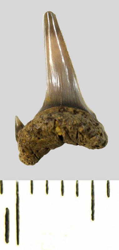 Зуб. Акула. Eostriatolamia subulata (Agassiz, 1843). Классификация: Хордовые Chordata, Позвоночные Vertebrata, Хрящевые рыбы Chondrichthyes, Пластиножаберные Elasmobranchii, Акулы Selachii, Ламнообразные Lamniformes, Песчаные акулы Odontaspididae