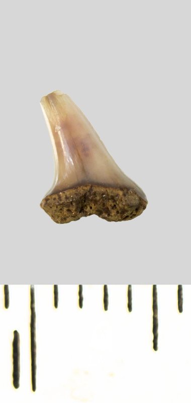 Зуб (фрагмент). Акула. Eostriatolamia subulata (Agassiz, 1843). Классификация: Хордовые Chordata, Позвоночные Vertebrata, Хрящевые рыбы Chondrichthyes, Пластиножаберные Elasmobranchii, Акулы Selachii, Ламнообразные Lamniformes, Песчаные акулы Odontaspididae