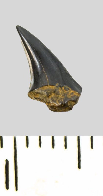 Зуб (фрагмент). Акула. Cretoxyrhinidae gen. et sp. indet. Классификация: Хордовые Chordata, Позвоночные Vertebrata, Хрящевые рыбы Chondrichthyes, Пластиножаберные Elasmobranchii, Акулы Selachii, Ламнообразные Lamniformes, Cretoxyrhinidae