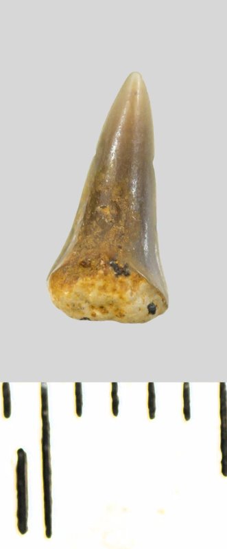 Зуб (фрагмент). Акула. Cretoxyrhinidae gen. et sp. indet. Классификация: Хордовые Chordata, Позвоночные Vertebrata, Хрящевые рыбы Chondrichthyes, Пластиножаберные Elasmobranchii, Акулы Selachii, Ламнообразные Lamniformes, Cretoxyrhinidae