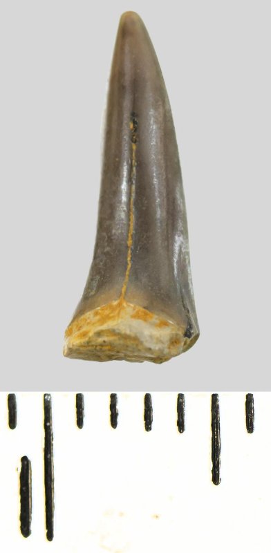 Зуб (фрагмент). Акула. Cretoxyrhinidae gen. et sp. indet. Классификация: Хордовые Chordata, Позвоночные Vertebrata, Хрящевые рыбы Chondrichthyes, Пластиножаберные Elasmobranchii, Акулы Selachii, Ламнообразные Lamniformes, Cretoxyrhinidae