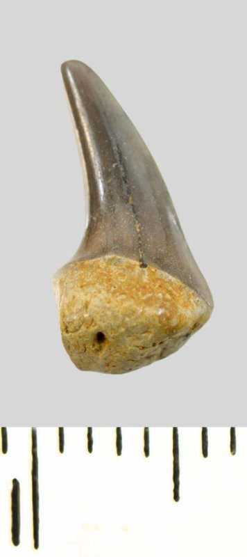 Зуб (фрагмент). Акула. Cretoxyrhinidae gen. et sp. indet. Классификация: Хордовые Chordata, Позвоночные Vertebrata, Хрящевые рыбы Chondrichthyes, Пластиножаберные Elasmobranchii, Акулы Selachii, Ламнообразные Lamniformes, Cretoxyrhinidae