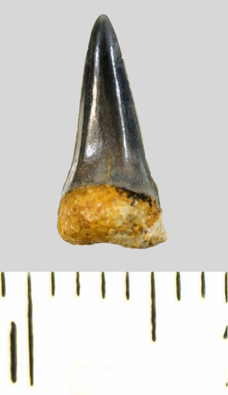 Зуб (фрагмент). Акула. Cretoxyrhinidae gen. et sp. indet. Классификация: Хордовые Chordata, Позвоночные Vertebrata, Хрящевые рыбы Chondrichthyes, Пластиножаберные Elasmobranchii, Акулы Selachii, Ламнообразные Lamniformes, Cretoxyrhinidae