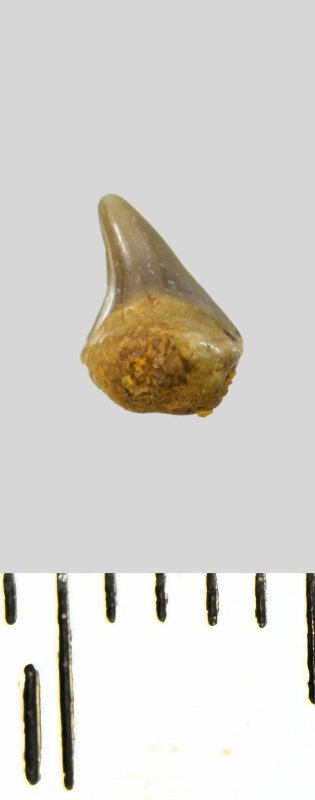 Зуб (фрагмент). Акула. Cretoxyrhinidae gen. et sp. indet. Классификация: Хордовые Chordata, Позвоночные Vertebrata, Хрящевые рыбы Chondrichthyes, Пластиножаберные Elasmobranchii, Акулы Selachii, Ламнообразные Lamniformes, Cretoxyrhinidae