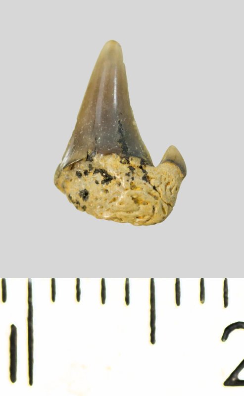 Зуб (фрагмент). Акула. Cretoxyrhinidae gen. et sp. indet. Классификация: Хордовые Chordata, Позвоночные Vertebrata, Хрящевые рыбы Chondrichthyes, Пластиножаберные Elasmobranchii, Акулы Selachii, Ламнообразные Lamniformes, Cretoxyrhinidae