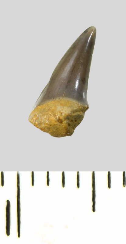 Зуб (фрагмент). Акула. Cretoxyrhinidae gen. et sp. indet. Классификация: Хордовые Chordata, Позвоночные Vertebrata, Хрящевые рыбы Chondrichthyes, Пластиножаберные Elasmobranchii, Акулы Selachii, Ламнообразные Lamniformes, Cretoxyrhinidae