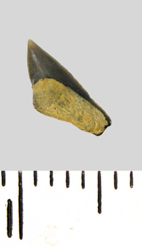 Зуб (фрагмент). Акула. Palaecorax falcatus (Agassiz, 1843). Классификация: Хордовые Chordata, Позвоночные Vertebrata, Хрящевые рыбы Chondrichthyes, Пластиножаберные Elasmobranchii, Акулы Selachii, Ламнообразные Lamniformes, Anacoracidae