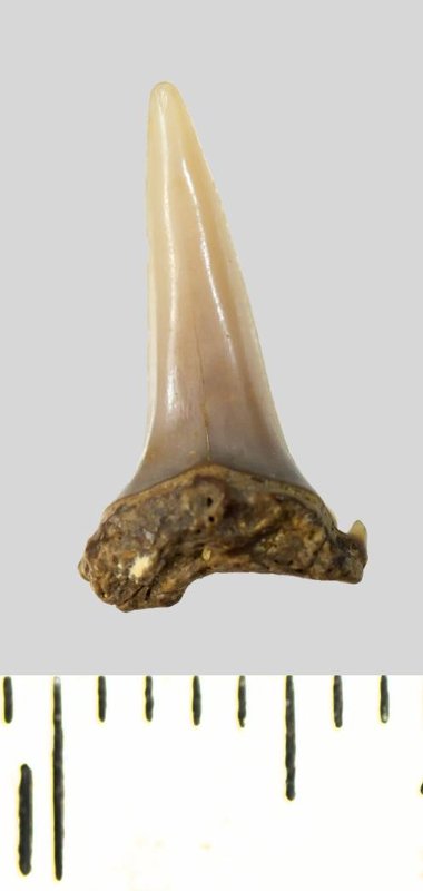 Зуб (фрагмент). Акула. Eostriatolamia subulata (Agassiz, 1843). Классификация: Хордовые Chordata, Позвоночные Vertebrata, Хрящевые рыбы Chondrichthyes, Пластиножаберные Elasmobranchii, Акулы Selachii, Ламнообразные Lamniformes, Песчаные акулы Odontaspididae