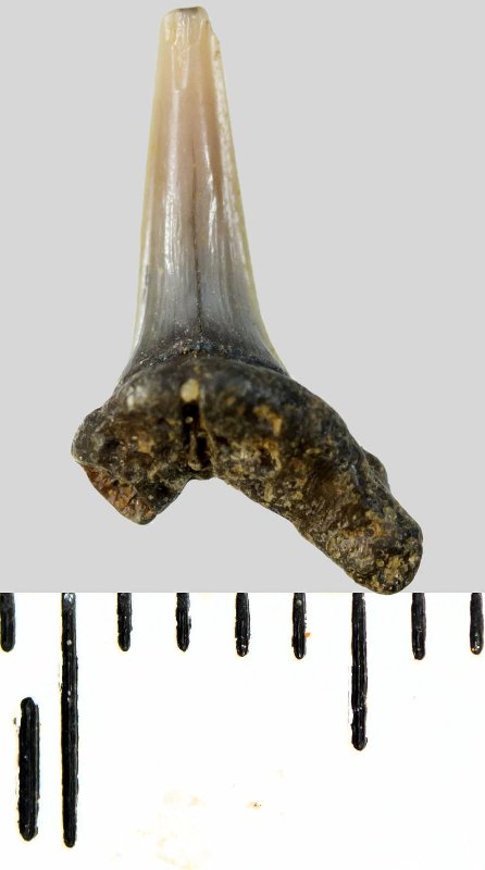 Зуб. Акула. Odontaspis striatula Dalinkevicius, 1935. Классификация: Хордовые Chordata, Позвоночные Vertebrata, Хрящевые рыбы Chondrichthyes, Пластиножаберные Elasmobranchii, Акулы Selachii, Ламнообразные Lamniformes