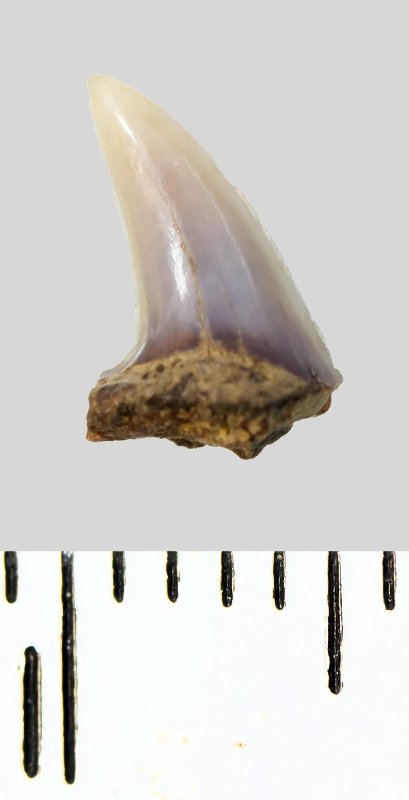 Зуб (фрагмент). Акула. Archaeolamna cf. kopingensis (Davis, 1890). Классификация: Хордовые Chordata, Позвоночные Vertebrata, Хрящевые рыбы Chondrichthyes, Пластиножаберные Elasmobranchii, Акулы Selachii, Ламнообразные Lamniformes