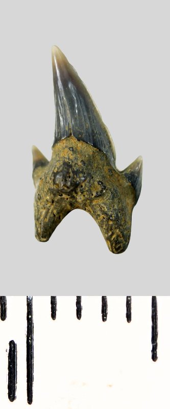 Зуб. Акула. Protolamna cf. sokolovi Capetta, 1980. Классификация: Хордовые Chordata, Позвоночные Vertebrata, Хрящевые рыбы Chondrichthyes, Пластиножаберные Elasmobranchii, Акулы Selachii, Ламнообразные Lamniformes