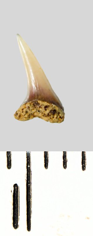 Зуб (фрагмент). Акула. Lamniformes gen. et sp. indet. Классификация: Хордовые Chordata, Позвоночные Vertebrata, Хрящевые рыбы Chondrichthyes, Пластиножаберные Elasmobranchii, Акулы Selachii, Ламнообразные Lamniformes