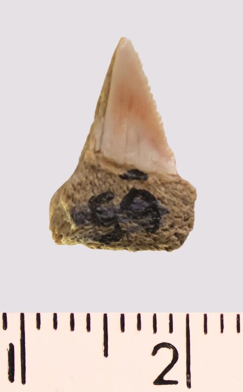 Зуб (фрагмент). Акула. Anacorax kaupi (Agassiz, 1843). Классификация: Хордовые Chordata, Позвоночные Vertebrata, Хрящевые рыбы Chondrichthyes, Пластиножаберные Elasmobranchii