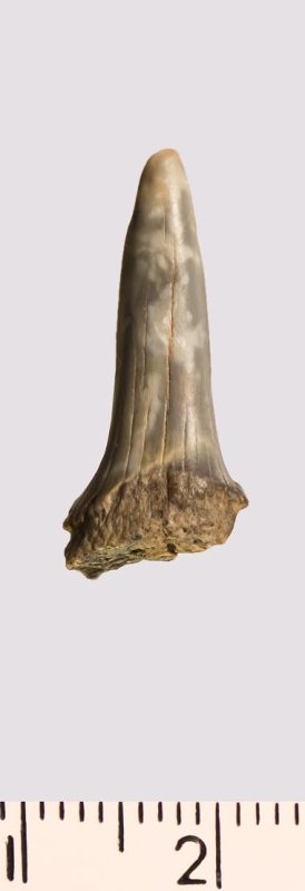 Зуб (фрагмент). Акула. Scapanorhynchus gigas Woodward, 1889. Классификация: Хордовые Chordata, Позвоночные Vertebrata, Хрящевые рыбы Chondrichthyes, Пластиножаберные Elasmobranchii