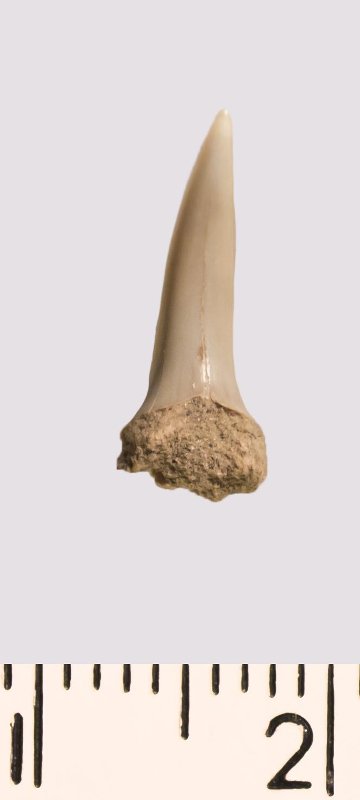 Зуб (фрагмент). Акула. Odontaspis venusta (Leriche, 1929). Классификация: Хордовые Chordata, Позвоночные Vertebrata, Хрящевые рыбы Chondrichthyes, Пластиножаберные Elasmobranchii