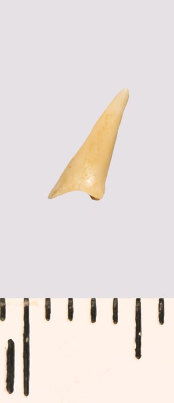 Зуб (фрагмент). Акула. Scapanorhynchus gracilis (Davis, 1890). Классификация: Хордовые Chordata, Позвоночные Vertebrata, Хрящевые рыбы Chondrichthyes, Пластиножаберные Elasmobranchii