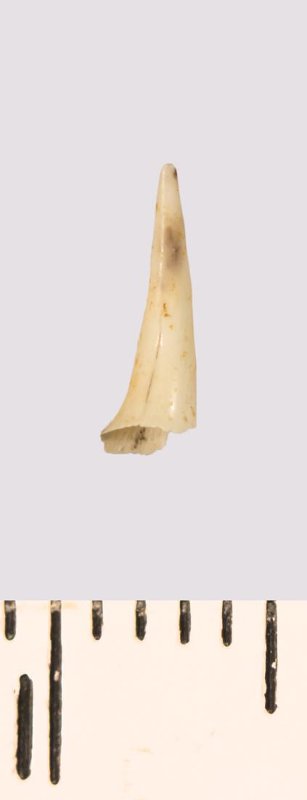 Зуб (фрагмент). Акула. Scapanorhynchus gracilis (Davis, 1890). Классификация: Хордовые Chordata, Позвоночные Vertebrata, Хрящевые рыбы Chondrichthyes, Пластиножаберные Elasmobranchii