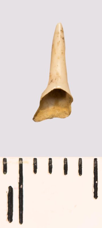 Зуб (фрагмент). Акула. Scapanorhynchus gracilis (Davis, 1890). Классификация: Хордовые Chordata, Позвоночные Vertebrata, Хрящевые рыбы Chondrichthyes, Пластиножаберные Elasmobranchii