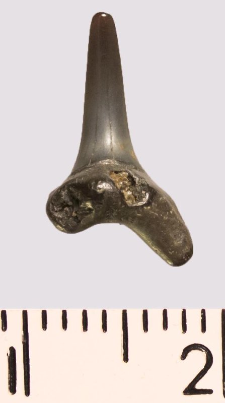 Зуб. Акула. Odontaspis macrorhiza (Cope) Leriche, 1902. Классификация: Хордовые Chordata, Позвоночные Vertebrata, Хрящевые рыбы Chondrichthyes, Пластиножаберные Elasmobranchii