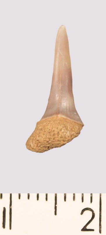 Зуб (фрагмент). Акула. Odontaspis venusta (Leriche, 1929). Классификация: Хордовые Chordata, Позвоночные Vertebrata, Хрящевые рыбы Chondrichthyes, Пластиножаберные Elasmobranchii