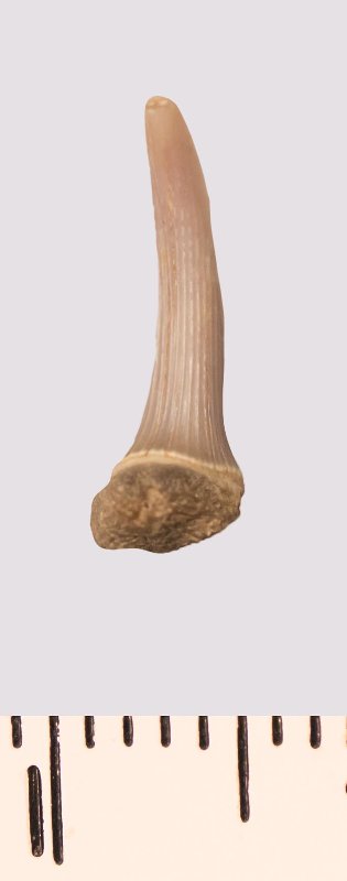 Зуб (фрагмент). Акула. Scapanorhynchus rhaphiodon Agassiz, 1843. Классификация: Хордовые Chordata, Позвоночные Vertebrata, Хрящевые рыбы Chondrichthyes, Пластиножаберные Elasmobranchii