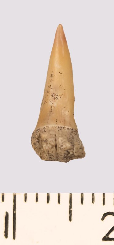 Зуб (фрагмент). Акула. Odontaspis venusta (Leriche, 1929). Классификация: Хордовые Chordata, Позвоночные Vertebrata, Хрящевые рыбы Chondrichthyes, Пластиножаберные Elasmobranchii