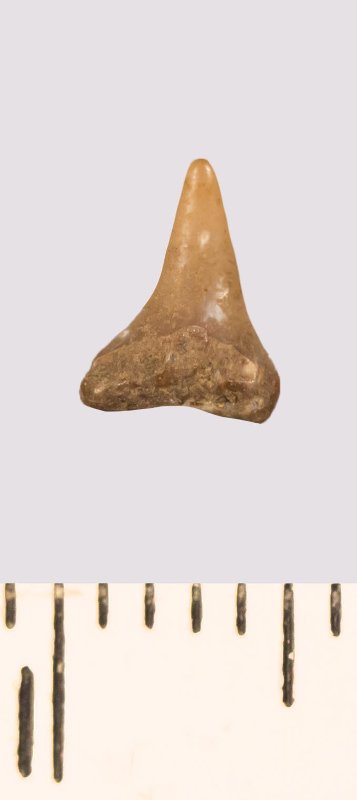 Зуб (фрагмент). Акула. Odontaspis venusta (Leriche, 1929). Классификация: Хордовые Chordata, Позвоночные Vertebrata, Хрящевые рыбы Chondrichthyes, Пластиножаберные Elasmobranchii