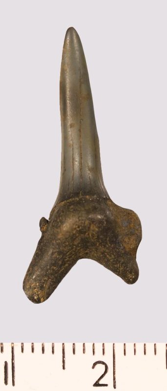 Зуб. Акула. Scapanorhynchus gigas Woodward, 1889. Классификация: Хордовые Chordata, Позвоночные Vertebrata, Хрящевые рыбы Chondrichthyes, Пластиножаберные Elasmobranchii