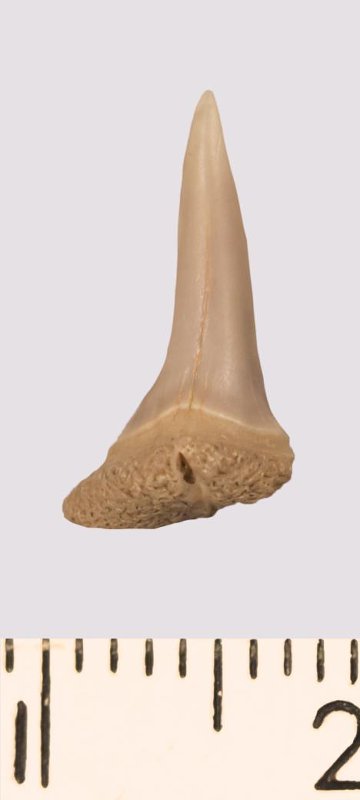 Зуб (фрагмент). Акула. Odontaspis venusta (Leriche, 1929). Классификация: Хордовые Chordata, Позвоночные Vertebrata, Хрящевые рыбы Chondrichthyes, Пластиножаберные Elasmobranchii