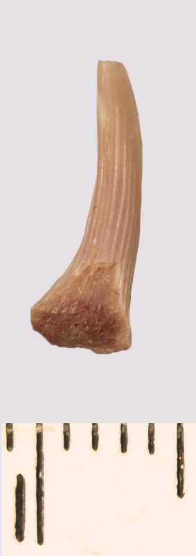 Зуб (фрагмент). Акула. Scapanorhynchus rhaphiodon Agassiz, 1843. Классификация: Хордовые Chordata, Позвоночные Vertebrata, Хрящевые рыбы Chondrichthyes, Пластиножаберные Elasmobranchii