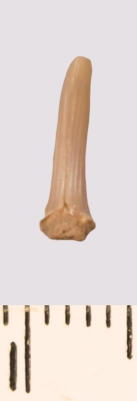 Зуб (фрагмент). Акула. Scapanorhynchus rhaphiodon Agassiz, 1843. Классификация: Хордовые Chordata, Позвоночные Vertebrata, Хрящевые рыбы Chondrichthyes, Пластиножаберные Elasmobranchii