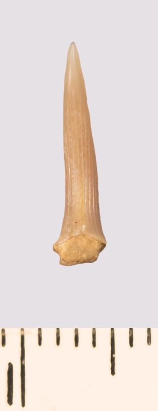 Зуб (фрагмент). Акула. Scapanorhynchus rhaphiodon Agassiz, 1843. Классификация: Хордовые Chordata, Позвоночные Vertebrata, Хрящевые рыбы Chondrichthyes, Пластиножаберные Elasmobranchii