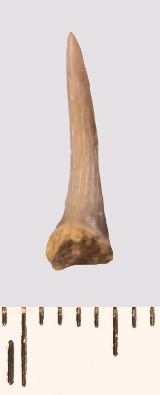 Зуб (фрагмент). Акула. Scapanorhynchus rhaphiodon Agassiz, 1843. Классификация: Хордовые Chordata, Позвоночные Vertebrata, Хрящевые рыбы Chondrichthyes, Пластиножаберные Elasmobranchii