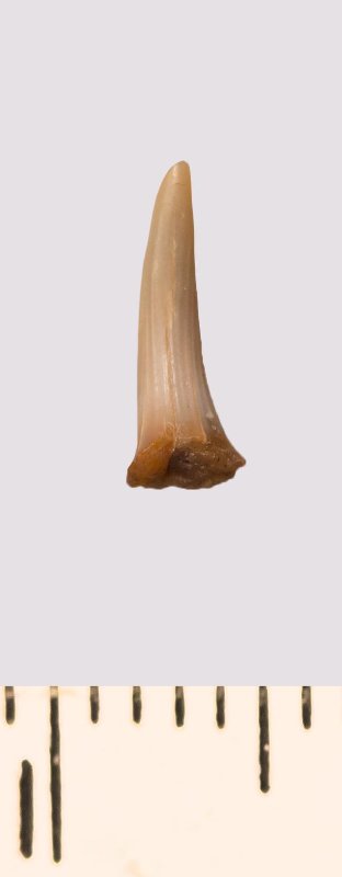 Зуб (фрагмент). Акула. Scapanorhynchus rhaphiodon Agassiz, 1843. Классификация: Хордовые Chordata, Позвоночные Vertebrata, Хрящевые рыбы Chondrichthyes, Пластиножаберные Elasmobranchii