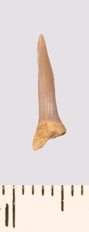 Зуб (фрагмент). Акула. Scapanorhynchus rhaphiodon Agassiz, 1843. Классификация: Хордовые Chordata, Позвоночные Vertebrata, Хрящевые рыбы Chondrichthyes, Пластиножаберные Elasmobranchii
