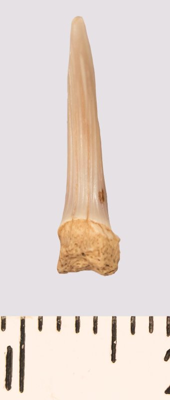 Зуб (фрагмент). Акула. Scapanorhynchus rhaphiodon Agassiz, 1843. Классификация: Хордовые Chordata, Позвоночные Vertebrata, Хрящевые рыбы Chondrichthyes, Пластиножаберные Elasmobranchii