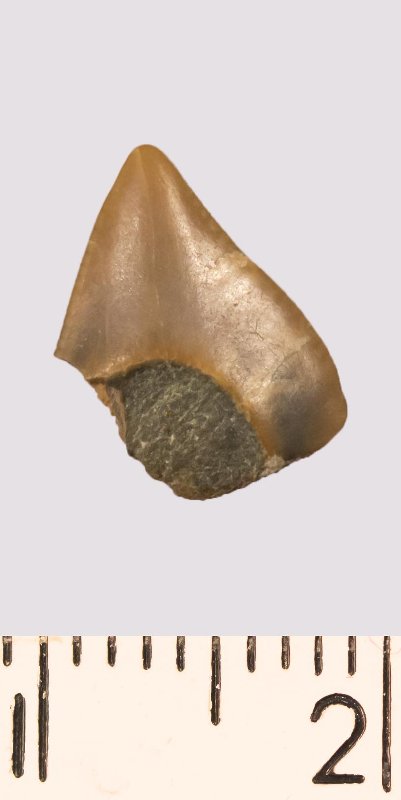 Зуб (фрагмент). Акула. Squalicorax sp. Классификация: Хордовые Chordata, Позвоночные Vertebrata, Хрящевые рыбы Chondrichthyes, Пластиножаберные Elasmobranchii