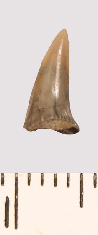 Зуб (фрагмент). Акула. Odontaspis macrorhiza (Cope) Leriche, 1902. Классификация: Хордовые Chordata, Позвоночные Vertebrata, Хрящевые рыбы Chondrichthyes, Пластиножаберные Elasmobranchii
