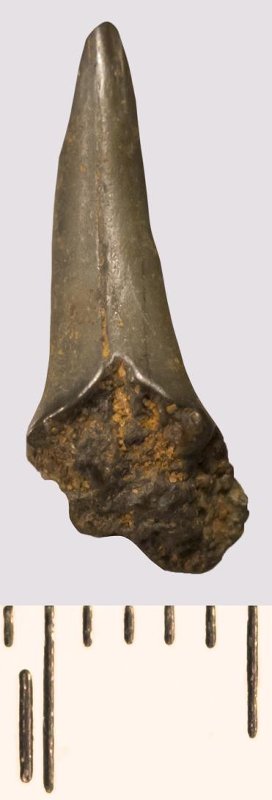 Зуб (фрагмент). Акула. Odontaspis macrorhiza (Cope) Leriche, 1902. Классификация: Хордовые Chordata, Позвоночные Vertebrata, Хрящевые рыбы Chondrichthyes, Пластиножаберные Elasmobranchii