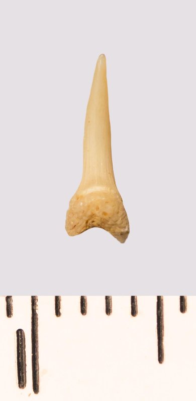 Зуб. Акула. Scapanorhynchus rhaphiodon Agassiz, 1843. Классификация: Хордовые Chordata, Позвоночные Vertebrata, Хрящевые рыбы Chondrichthyes, Пластиножаберные Elasmobranchii