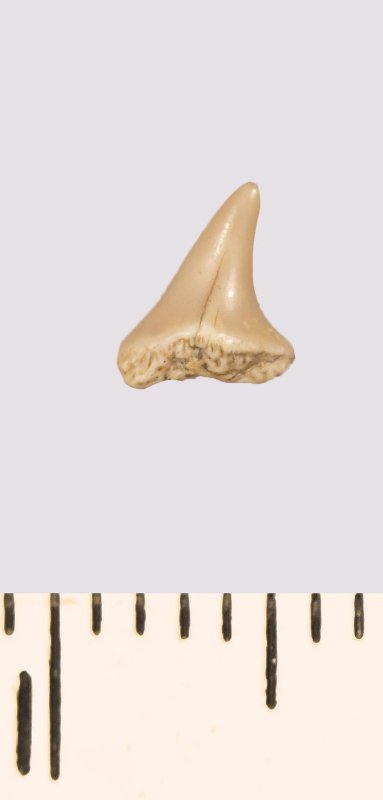 Зуб (фрагмент). Акула. Odontaspis venusta (Leriche, 1929). Классификация: Хордовые Chordata, Позвоночные Vertebrata, Хрящевые рыбы Chondrichthyes, Пластиножаберные Elasmobranchii