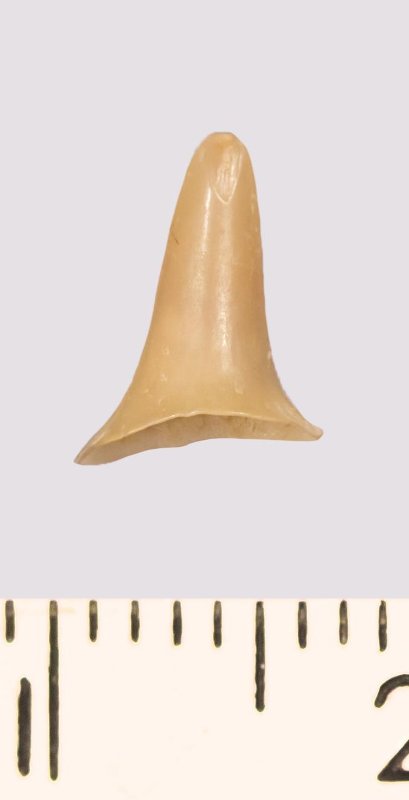 Зуб (фрагмент). Акула. Odontaspis venusta (Leriche, 1929). Классификация: Хордовые Chordata, Позвоночные Vertebrata, Хрящевые рыбы Chondrichthyes, Пластиножаберные Elasmobranchii