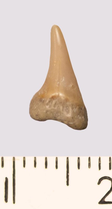 Зуб (фрагмент). Акула. Odontaspis venusta (Leriche, 1929). Классификация: Хордовые Chordata, Позвоночные Vertebrata, Хрящевые рыбы Chondrichthyes, Пластиножаберные Elasmobranchii