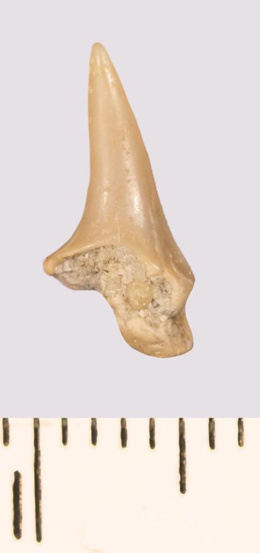 Зуб (фрагмент). Акула. Odontaspis venusta (Leriche, 1929). Классификация: Хордовые Chordata, Позвоночные Vertebrata, Хрящевые рыбы Chondrichthyes, Пластиножаберные Elasmobranchii