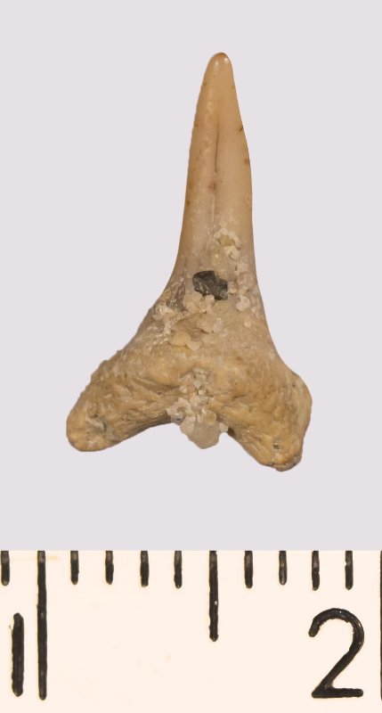 Зуб. Акула. Odontaspis venusta (Leriche, 1929). Классификация: Хордовые Chordata, Позвоночные Vertebrata, Хрящевые рыбы Chondrichthyes, Пластиножаберные Elasmobranchii