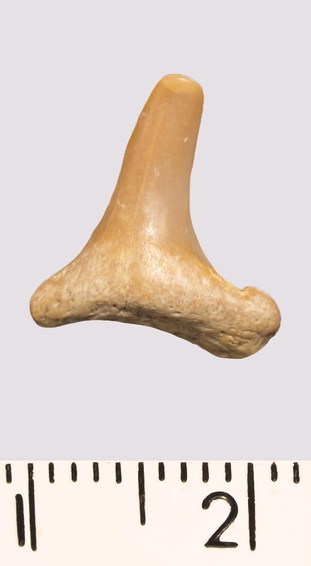 Зуб. Акула. Scapanorhynchus gigas Woodward, 1889. Классификация: Хордовые Chordata, Позвоночные Vertebrata, Хрящевые рыбы Chondrichthyes, Пластиножаберные Elasmobranchii