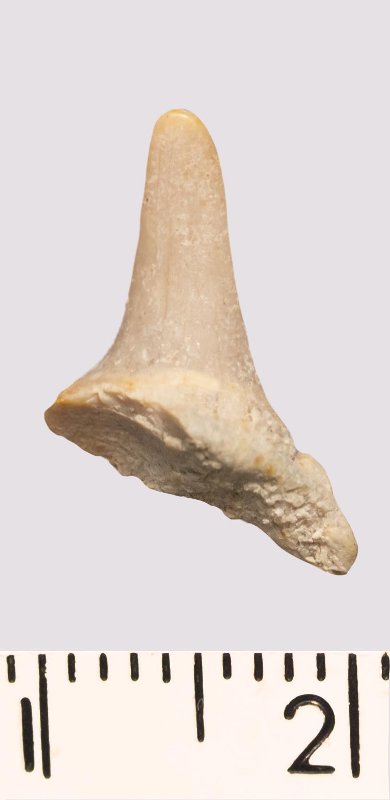 Зуб. Акула. Scapanorhynchus gigas Woodward, 1889. Классификация: Хордовые Chordata, Позвоночные Vertebrata, Хрящевые рыбы Chondrichthyes, Пластиножаберные Elasmobranchii