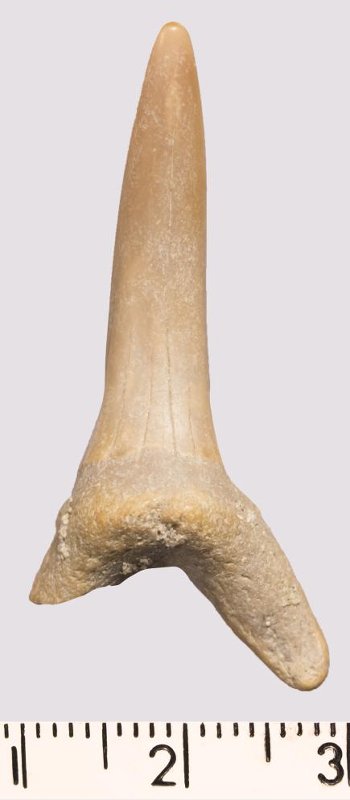 Зуб. Акула. Scapanorhynchus gigas Woodward, 1889. Классификация: Хордовые Chordata, Позвоночные Vertebrata, Хрящевые рыбы Chondrichthyes, Пластиножаберные Elasmobranchii