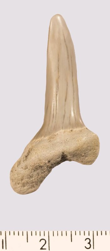 Зуб. Акула. Scapanorhynchus gigas Woodward, 1889. Классификация: Хордовые Chordata, Позвоночные Vertebrata, Хрящевые рыбы Chondrichthyes, Пластиножаберные Elasmobranchii